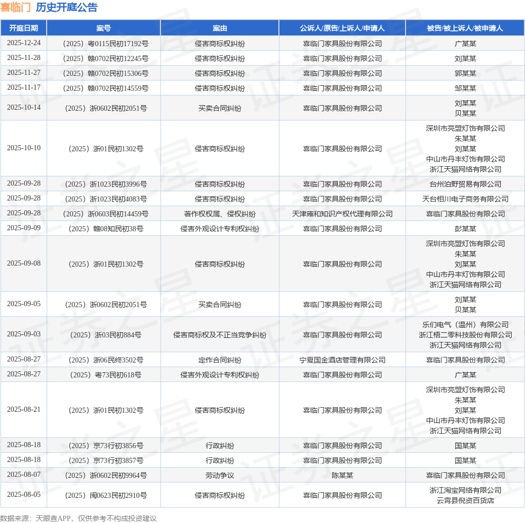 案号:(2025)赣0702民初14559号根据统计,近一年内以喜临门家具股份有限公司为当事人的历史开庭公告有55则,其中案由为“侵害商标权纠纷”的公告以19则居首,其次为“买卖合同纠纷”有11则,“侵害外观设计专利权纠纷”有7则。历史开庭公告(前20条)如下: