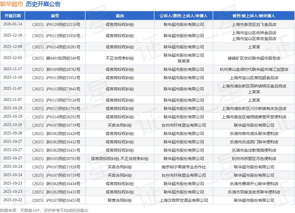 案号:(2025)浙0109民初28782号根据统计,近一年内以联华超市股份有限公司为当事人的历史开庭公告有121则,其中案由为“侵害商标权纠纷”的公告以63则居首,其次为“买卖合同纠纷”有12则,“商标权权属、侵权纠纷”有10则。历史开庭公告(前20条)如下: