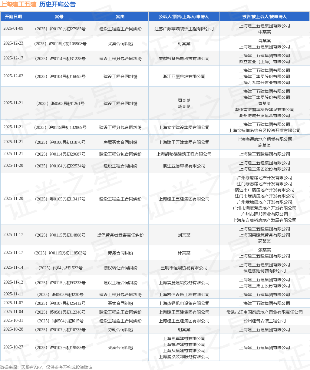 案号:(2025)沪0115民初14808号根据统计,近一年内以上海建工五建集团有限公司为当事人的历史开庭公告有295则,其中案由为“建设工程施工合同纠纷”的公告以59则居首,其次为“建设工程分包合同纠纷”有55则,“劳务合同纠纷”有34则。历史开庭公告(前20条)如下: