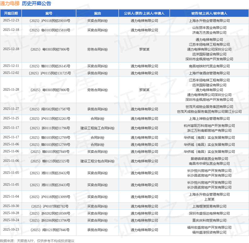 案号:(2025)浙0111民初11796号根据统计,近一年内以通力电梯有限公司为当事人的历史开庭公告有283则,其中案由为“买卖合同纠纷”的公告以164则居首,其次为“承揽合同纠纷”有38则,“合同纠纷”有28则。历史开庭公告(前20条)如下: