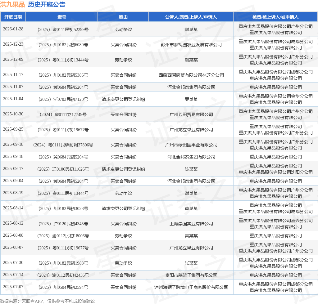 案号:(2025)川0182民初5386号根据统计,近一年内以重庆洪九果品股份有限公司为当事人的历史开庭公告有107则,其中案由为“买卖合同纠纷”的公告以27则居首,其次为“金融借款合同纠纷”有22则,“劳动争议”有18则。历史开庭公告(前20条)如下: