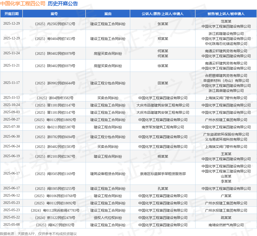 案号:(2025)浙0902民初6644号根据统计,近一年内以中国化学工程第四建设有限公司为当事人的历史开庭公告有59则,其中案由为“建设工程施工合同纠纷”的公告以23则居首,其次为“建设工程合同纠纷”有8则,“建筑设备租赁合同纠纷”有6则。历史开庭公告(前20条)如下: