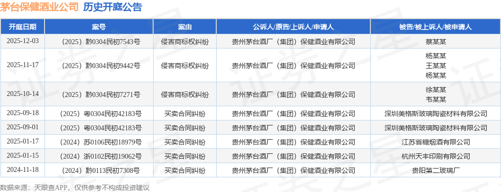 案号:(2025)黔0304民初9442号根据统计,近一年内以贵州茅台酒厂(集团)保健酒业有限公司为当事人的历史开庭公告有8则,其中案由为“买卖合同纠纷”的公告以5则居首,其次为“侵害商标权纠纷”有3则。历史开庭公告如下: