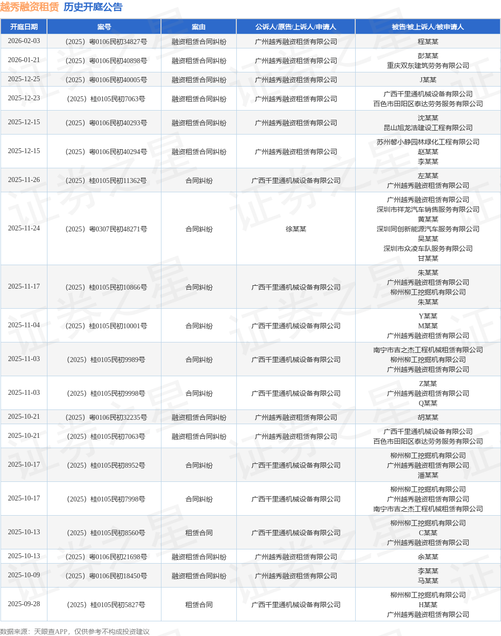 案号:(2025)桂0105民初10866号根据统计,近一年内以广州越秀融资租赁有限公司为当事人的历史开庭公告有91则,其中案由为“融资租赁合同纠纷”的公告以65则居首,其次为“租赁合同纠纷”有12则,“合同纠纷”有8则。历史开庭公告(前20条)如下: