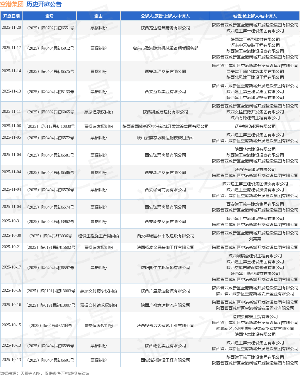 案号:(2025)陕0404民初5012号根据统计,近一年内以陕西省西咸新区空港新城开发建设集团有限公司为当事人的历史开庭公告有173则,其中案由为“票据追索权纠纷”的公告以78则居首,其次为“票据纠纷”有72则,“合同纠纷”有11则。历史开庭公告(前20条)如下: