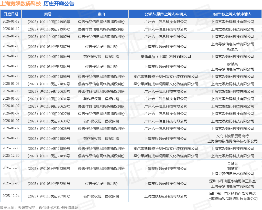 案号:(2025)沪0110民初19059号根据统计,近一年内以上海宽娱数码科技有限公司为当事人的历史开庭公告有757则,其中案由为“侵害作品信息网络传播权纠纷”的公告以405则居首,其次为“著作权权属、侵权纠纷”有159则,“网络侵权责任纠纷”有50则。历史开庭公告(前20条)如下: