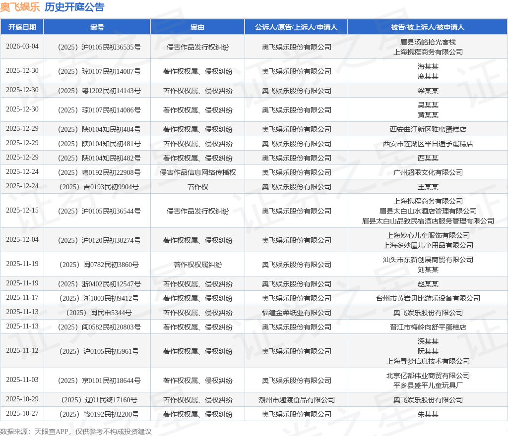 案号:(2025)浙1003民初9412号根据统计,近一年内以奥飞娱乐股份有限公司为当事人的历史开庭公告有419则,其中案由为“著作权权属、侵权纠纷”的公告以216则居首,其次为“侵害作品发行权纠纷”有58则,“侵害作品信息网络传播权纠纷”有29则。历史开庭公告(前20条)如下: