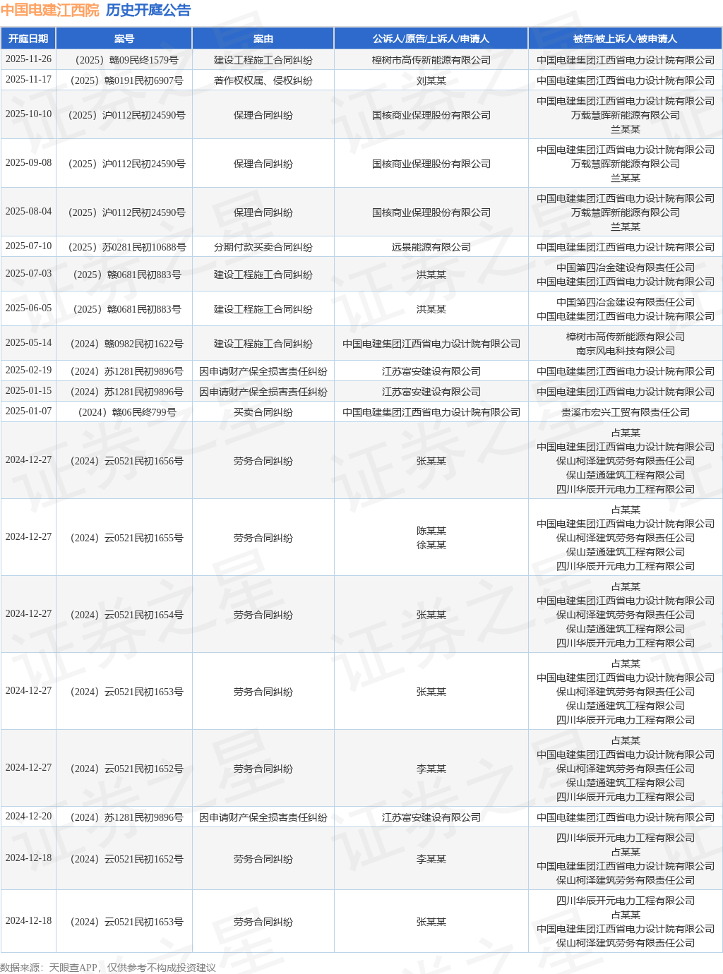 案号:(2025)赣0191民初6907号根据统计,近一年内以中国电建集团江西省电力设计院有限公司为当事人的历史开庭公告有28则,其中案由为“劳务合同纠纷”的公告以15则居首,其次为“建设工程施工合同纠纷”有4则,“保理合同纠纷”有3则。历史开庭公告(前20条)如下: