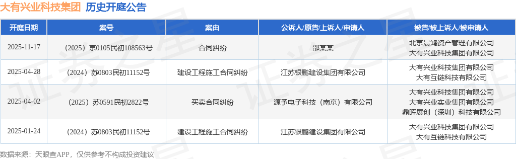 案号:(2025)京0105民初108563号根据统计,近一年内以大有兴业科技集团有限公司为当事人的历史开庭公告有4则,其中案由为“建设工程施工合同纠纷”的公告以2则居首,其次为“买卖合同纠纷”有1则,“合同纠纷”有1则。历史开庭公告如下: