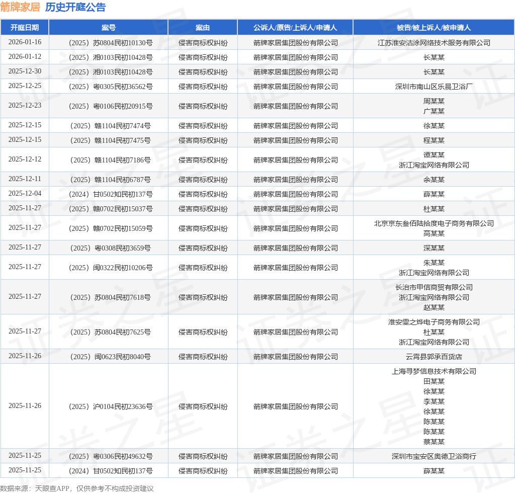 案号:(2025)粤0307民初27041号根据统计,近一年内以箭牌家居集团股份有限公司为当事人的历史开庭公告有499则,其中案由为“侵害商标权纠纷”的公告以437则居首,其次为“商标权权属、侵权纠纷”有20则,“不正当竞争纠纷”有8则。历史开庭公告(前20条)如下: