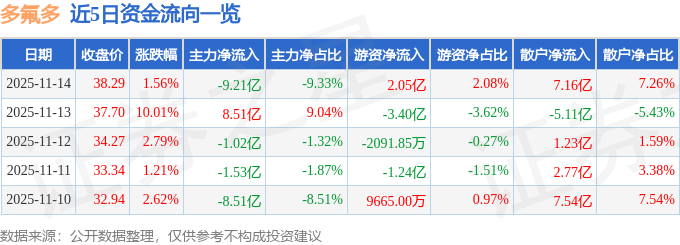 证券之星消息,截至2025年11月14日收盘,多氟多(002407)报收于38.29元,上涨1.56%,换手率23.99%,成交量259.19万手,成交额98.7亿元。