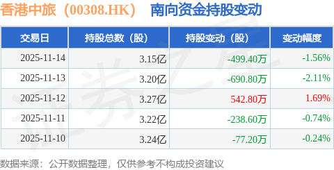 证券之星消息,11月14日南向资金减持499.4万股香港中旅(00308.HK)。近5个交易日中,获南向资金减持的有4天,累计净减持963.2万股。近20个交易日中,获南向资金减持的有18天,累计净减持1.14亿股。截至目前,南向资金持有香港中旅(00308.HK)3.15亿股,占公司已发行普通股的5.69%。