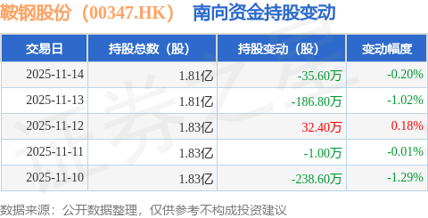 证券之星消息,11月14日南向资金减持35.6万股鞍钢股份(00347.HK)。近5个交易日中,获南向资金减持的有4天,累计净减持429.6万股。近20个交易日中,获南向资金减持的有13天,累计净减持486.2万股。截至目前,南向资金持有鞍钢股份(00347.HK)1.81亿股,占公司已发行普通股的12.82%。