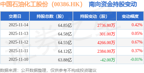 证券之星消息,11月14日南向资金增持2736.8万股中国石油化工股份(00386.HK)。近5个交易日中,获南向资金增持的有4天,累计净增持9645.8万股。近20个交易日中,获南向资金减持的有10天,累计净减持252.69万股。截至目前,南向资金持有中国石油化工股份(00386.HK)64.85亿股,占公司已发行普通股的27.07%。