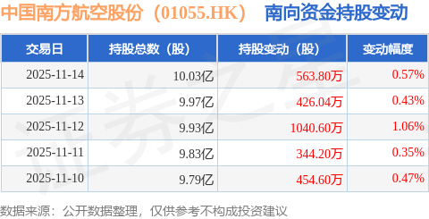 证券之星消息,11月14日南向资金增持563.8万股中国南方航空股份(01055.HK)。近5个交易日中,获南向资金增持的有5天,累计净增持2829.24万股。近20个交易日中,获南向资金增持的有18天,累计净增持1.0亿股。截至目前,南向资金持有中国南方航空股份(01055.HK)10.03亿股,占公司已发行普通股的21.59%。