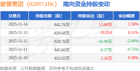 证券之星消息,11月14日南向资金增持13.08万股蜜雪集团(02097.HK)。近5个交易日中,获南向资金减持的有2天,累计净减持6.02万股。近20个交易日中,获南向资金增持的有12天,累计净增持26.46万股。截至目前,南向资金持有蜜雪集团(02097.HK)842.76万股,占公司已发行普通股的5.57%。