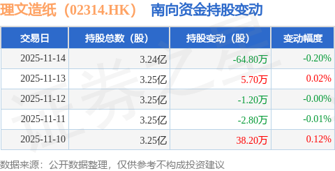 证券之星消息,11月14日南向资金减持64.8万股理文造纸(02314.HK)。近5个交易日中,获南向资金减持的有3天,累计净减持24.9万股。近20个交易日中,获南向资金增持的有10天,累计净增持17.6万股。截至目前,南向资金持有理文造纸(02314.HK)3.24亿股,占公司已发行普通股的7.53%。