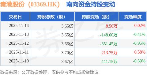 证券之星消息,11月14日南向资金增持8.5万股秦港股份(03369.HK)。近5个交易日中,获南向资金减持的有3天,累计净减持388.95万股。近20个交易日中,获南向资金增持的有8天,累计净增持2248.15万股。截至目前,南向资金持有秦港股份(03369.HK)3.65亿股,占公司已发行普通股的43.94%。