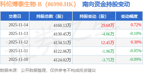 证券之星消息,11月14日南向资金增持29.68万股科伦博泰生物-B(06990.HK)。近5个交易日中,获南向资金增持的有2天,累计净增持32.36万股。近20个交易日中,获南向资金增持的有10天,累计净增持50.39万股。截至目前,南向资金持有科伦博泰生物-B(06990.HK)4160.13万股,占公司已发行普通股的25.55%。