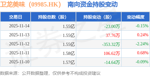 证券之星消息,11月14日南向资金减持23.0万股卫龙美味(09985.HK)。近5个交易日中,获南向资金减持的有3天,累计净减持246.58万股。近20个交易日中,获南向资金增持的有12天,累计净增持708.83万股。截至目前,南向资金持有卫龙美味(09985.HK)1.55亿股,占公司已发行普通股的6.36%。