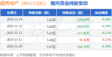 证券之星消息,11月14日南向资金减持329.6万股越秀地产(00123.HK)。近5个交易日中,获南向资金减持的有4天,累计净减持766.1万股。近20个交易日中,获南向资金减持的有10天,累计净减持226.53万股。截至目前,南向资金持有越秀地产(00123.HK)5.61亿股,占公司已发行普通股的13.91%。