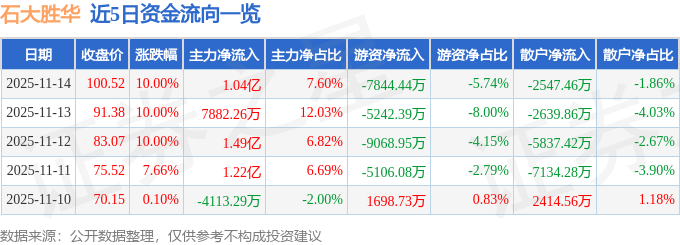 证券之星消息,截至2025年11月14日收盘,石大胜华(603026)报收于100.52元,上涨10.0%,已连续涨停3天,换手率6.8%,成交量13.78万手,成交额13.67亿元。