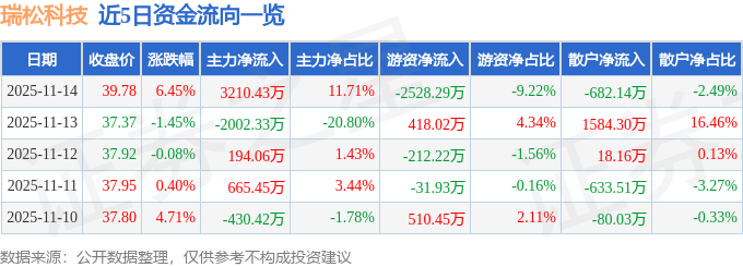 证券之星消息,截至2025年11月14日收盘,瑞松科技(688090)报收于39.78元,上涨6.45%,换手率5.71%,成交量6.98万手,成交额2.74亿元。