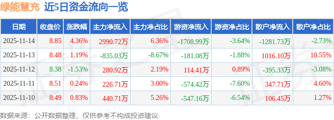 证券之星消息,截至2025年11月14日收盘,绿能慧充(600212)报收于8.85元,上涨4.36%,换手率10.32%,成交量53.12万手,成交额4.7亿元。