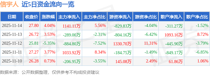 证券之星消息,截至2025年11月14日收盘,信宇人(688573)报收于27.8元,上涨4.04%,换手率13.86%,成交量7.38万手,成交额2.05亿元。