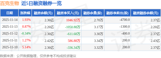 证券之星消息,截至2025年11月14日收盘,百克生物(688276)报收于23.77元,上涨1.93%,换手率2.37%,成交量9.8万手,成交额2.35亿元。