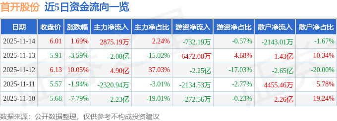 证券之星消息,截至2025年11月14日收盘,首开股份(600376)报收于6.01元,上涨1.69%,换手率8.16%,成交量210.37万手,成交额12.81亿元。