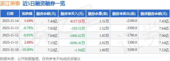 浙江荣泰融资融券信息显示,融资方面,当日融资买入1.4亿元,融资偿还9926.84万元,融资净买入4117.51万元。融券方面,融券卖出2900.0股,融券偿还5000.0股,融券余量1.31万股,融券余额110.75万元。融资融券余额7.45亿元。