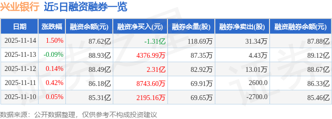 兴业银行融资融券信息显示,融资方面,当日融资买入2.75亿元,融资偿还4.06亿元,融资净偿还1.31亿元。融券方面,融券卖出32.52万股,融券偿还1.18万股,融券余量118.69万股,融券余额2563.7万元。融资融券余额87.88亿元。