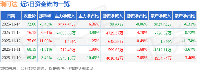 证券之星消息,截至2025年11月14日收盘,瑞可达(688800)报收于72.0元,下跌5.45%,换手率4.2%,成交量8.65万手,成交额6.26亿元。