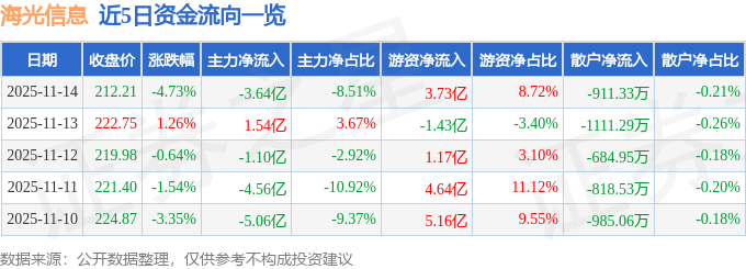 证券之星消息,截至2025年11月14日收盘,海光信息(688041)报收于212.21元,下跌4.73%,换手率0.85%,成交量19.86万手,成交额42.79亿元。