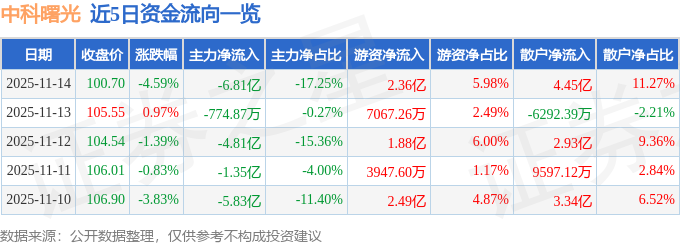 11月14日的资金流向数据方面,主力资金净流出6.81亿元,占总成交额17.25%,游资资金净流入2.36亿元,占总成交额5.98%,散户资金净流入4.45亿元,占总成交额11.27%。