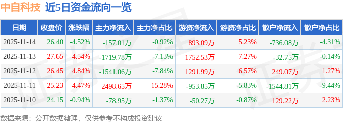 证券之星消息,截至2025年11月14日收盘,中自科技(688737)报收于26.4元,下跌4.52%,换手率5.36%,成交量6.4万手,成交额1.71亿元。