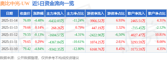 证券之星消息,截至2025年11月14日收盘,奥比中光(688322)报收于76.09元,下跌4.48%,换手率2.54%,成交量7.43万手,成交额5.72亿元。