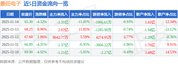 证券之星消息,截至2025年11月14日收盘,景旺电子(603228)报收于65.3元,下跌4.32%,换手率1.77%,成交量17.31万手,成交额11.45亿元。