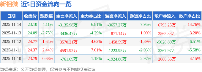 证券之星消息,截至2025年11月14日收盘,新相微(688593)报收于23.1元,下跌4.11%,换手率6.1%,成交量19.67万手,成交额4.6亿元。