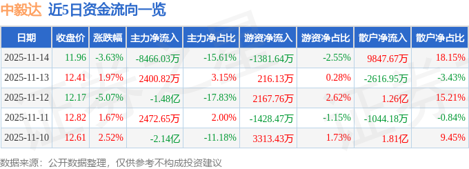 证券之星消息,截至2025年11月14日收盘,中毅达(600610)报收于11.96元,下跌3.63%,换手率6.3%,成交量44.67万手,成交额5.43亿元。