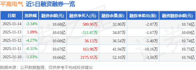 平高电气融资融券信息显示,融资方面,当日融资买入6727.81万元,融资偿还6146.91万元,融资净买入580.9万元。融券方面,融券卖出1900.0股,融券偿还2.26万股,融券余量32.8万股,融券余额588.76万元。融资融券余额10.74亿元。
