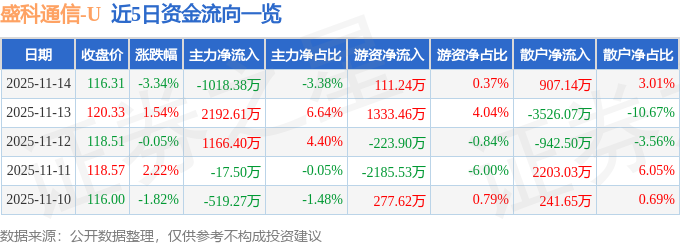 证券之星消息,截至2025年11月14日收盘,盛科通信(688702)报收于116.31元,下跌3.34%,换手率1.26%,成交量2.56万手,成交额3.01亿元。