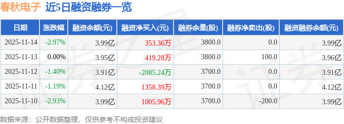 春秋电子融资融券信息显示,融资方面,当日融资买入4541.08万元,融资偿还4187.72万元,融资净买入353.36万元。融券方面,融券卖出0.0股,融券偿还0.0股,融券余量3800.0股,融券余额5.72万元。融资融券余额3.99亿元。