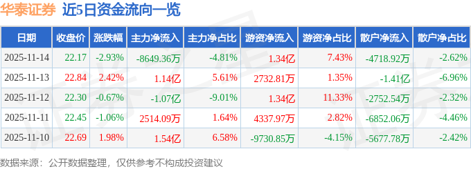 证券之星消息,截至2025年11月14日收盘,华泰证券(601688)报收于22.17元,下跌2.93%,换手率1.1%,成交量80.57万手,成交额17.98亿元。
