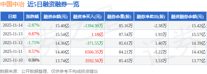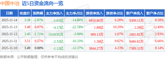 证券之星消息,截至2025年11月14日收盘,中国中冶(601618)报收于3.38元,下跌2.87%,换手率1.79%,成交量318.73万手,成交额10.85亿元。