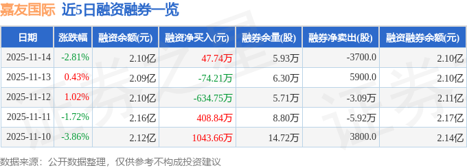 嘉友国际融资融券信息显示,融资方面,当日融资买入964.43万元,融资偿还916.69万元,融资净买入47.74万元。融券方面,融券卖出600.0股,融券偿还4300.0股,融券余量5.93万股,融券余额80.17万元。融资融券余额2.1亿元。