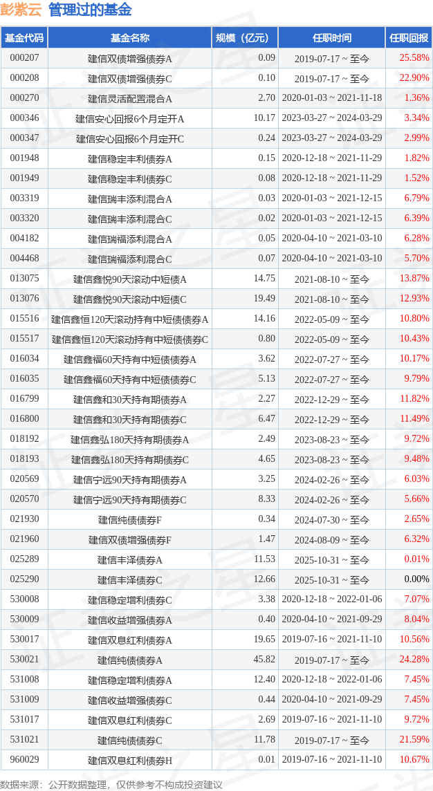 彭紫云先生:中国国籍,硕士。2013年7月加入建信基金,历任研究部助理研究员、固定收益投资债券研究员和基金经理助理。2019年7月17日起任建信纯债债券型证券投资基金、建信双债增强债券型证券投资基金的基金经理;2019年7月17日至2021年11月10日任建信双息红利债券型证券投资基金的基金经理;2020年1月3日至2021年11月18日任建信灵活配置混合型证券投资基金的基金经理;2020年1月3日至2021年12月14日任建信瑞丰添利混合型证券投资基金的基金经理;2020年4月10日至2021年3月9日任建信瑞福添利混合型证券投资基金;2020年4月10日至2021年9月29日任建信收益增强债券型证券投资基金的基金经理;2020年12月18日至2021年11月28日任建信稳定丰利债券型证券投资基金的基金经理;2020年12月18日至2022年1月6日任建信稳定增利债券型证券投资基金的基金经理;2021年8月10日起任建信鑫悦90天滚动持有中短债债券型发起式证券投资基金的基金经理;2022年5月9日起任建信鑫恒120天滚动持有中短债债券型证券投资基金的基金经理。2022年7月27日起担任建信鑫福60天持有期中短债债券型证券投资基金的基金经理。2022年12月29日起任建信鑫和30天持有期债券型证券投资基金的基金经理。2023年3月27日至2024年03月29日担任建信安心回报6个月定期开放债券型证券投资基金基金经理。2023年8月23日起任建信鑫弘180天持有期债券型证券投资基金的基金经理;2024年2月26日起任建信宁远90天持有期债券型证券投资基金的基金经理。