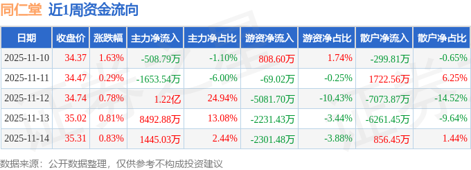 资金流向数据方面,本周同仁堂主力资金合计净流入1.99亿元,游资资金合计净流出8875.04万元,散户资金合计净流出1.11亿元。本周资金流向一览见下表: