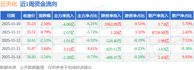 资金流向数据方面,本周云天化主力资金合计净流出7.3亿元,游资资金合计净流入1.35亿元,散户资金合计净流入5.96亿元。本周资金流向一览见下表: